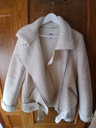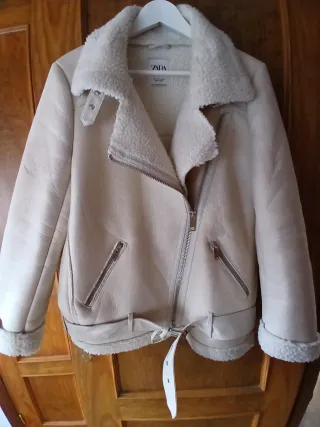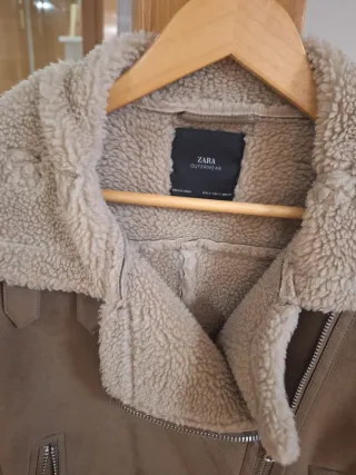 Chaqueta estilo biker de Zara con forro de borreguito. - Diseño tipo aviador. - Cierre de cremallera asimétrica. - Bolsillos frontales con cremallera. - Cuello con solapas y detalle de borreguito.