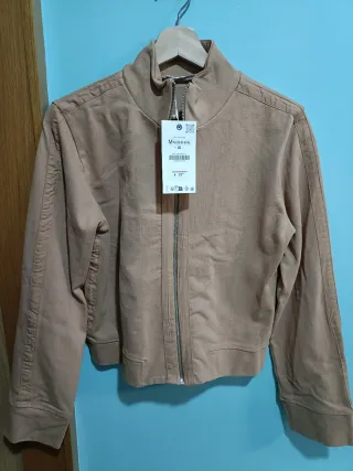 Abrigo estilo bomber de Zara, confeccionado en tejido Manteco. - Cierre de cremallera frontal. - Cuello redondo. - Diseño moderno y versátil. Talla s oversize