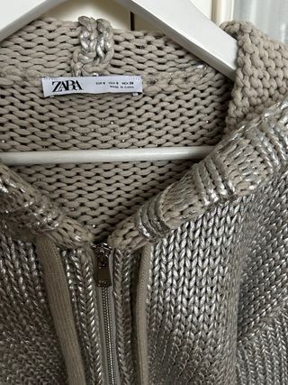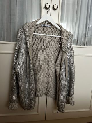 Chaqueta de punto con un diseño llamativo y detalles brillantes. - Tejido de punto grueso. - Mangas y detalles frontales con acabado plateado brillante. - Cierre de cremallera. - Capucha integrada. -talla como una M -abriga mucho se ha usado un par de veces