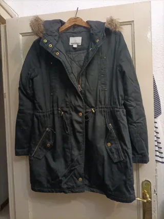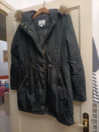 Chaqueta de estilo parka con capucha y detalles de pelo sintético. Es más bien una talla M - Cierre de cremallera. - Cintura ajustable con cordón. - Bolsillos frontales con solapa y cremallera.