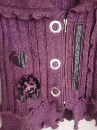 Chaqueta de punto con un diseño original y detalles únicos. 88% acrilico 42% lana - Cuello amplio y acanalado. - Cierre de cremallera. - Adornos de corazones y flor. - Puños y bajo con volantes.