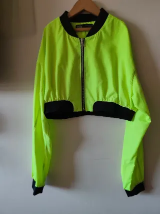 Chaqueta crop top. Marca: Zara. Color: Amarillo fosforito, en las fotos no se aprecia bien su color intenso. Está como nueva, poco uso. Está en perfecto estado.