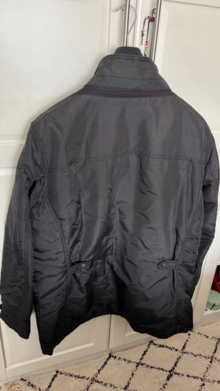 Chaqueta tipo bomber en color negro, muy abrigada y cómoda. Ideal para el uso diario en invierno o días de frío. • Capucha: Forrada con pelo suave (tipo peluche) para mayor calidez. • Cierre: Cremallera central protegida por solapa con botones a presión para que no pase el viento. • Ajuste: Cintura y puños elásticos de punto, estilo bomber clásica. • Bolsillos: Dispone de varios bolsillos exteriores funcionales. • Estado: En muy buen estado, sin roturas ni desgaste en el tejido. Es una prenda ligera pero que abriga mucho gracias a su acolchado.