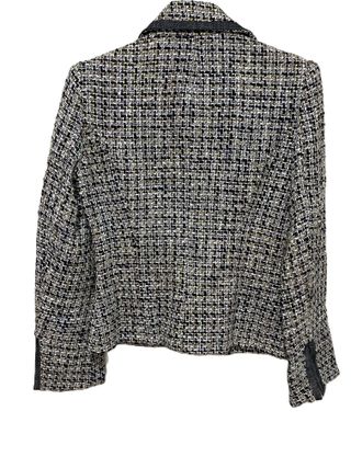 Elegante chaqueta de tweed con un diseño clásico. - Tejido texturizado en tonos marino y blanco. - Detalle de ribete en contraste. - Bolsillos frontales con solapa. - Cierre de botones.