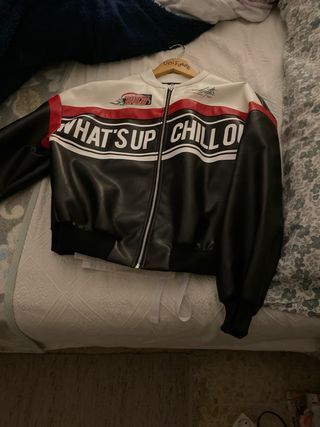 Chaqueta de cuero con un diseño llamativo y moderno. solo esta semana - Material: Cuero sintético. - Detalles: Rayas blancas y rojas. - Cierre: Cremallera frontal
