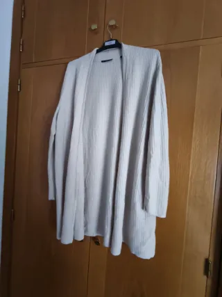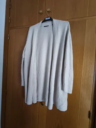 Chaqueta larga de punto fino en color beige. Es una prenda versátil y cómoda. - Diseño abierto. - Tejido acanalado. - Manga larga.