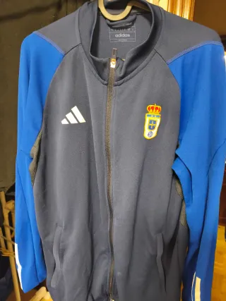 Chaqueta deportiva del Real Oviedo. - Diseño en azul marino y azul. - Logo de Adidas en blanco. - Escudo del Real Oviedo bordado.