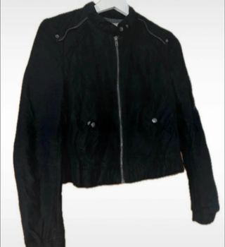 Chaqueta estilo motero con forro interior de borreguillo. • Largo: 53cm. - Queda como una M - Cierre asimétrico con cremallera. - Bolsillos frontales con cremallera. - Cuello con solapas.