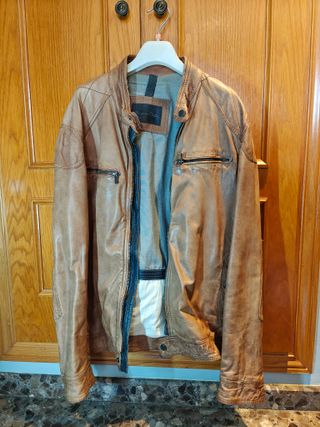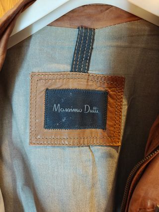 Chaqueta de piel auténtica Massimo Dutti en color marrón cuero envejecido, estilo biker / café racer con cremallera frontal y bolsillos con cremallera. Prenda de gran calidad con diseño clásico de la marca española Massimo Dutti, conocida por su ropa elegante y materiales premium. La piel tiene un acabado natural con efecto envejecido que le da un look vintage muy atractivo.
