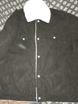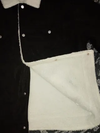 Chaqueta de pana negra con detalles en blanco. - Cuello forrado de borreguito blanco. - Cierre de botones. - Bolsillos en el pecho. ❗Esta nueva, me la puse una sola vez, la vendo porque me viene grande❗ ❗NO ES DE MARCA, LO PUSE PORQUE SINO NO DEJABA SUBIRLA❗