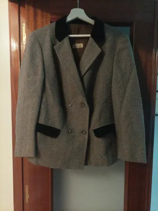 Elegante chaqueta con un diseño clásico y detalles distintivos. - Tejido con patrón de espiga. - Solapa y bolsillos con acabado en terciopelo negro. - Cierre de doble botón.