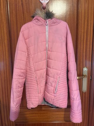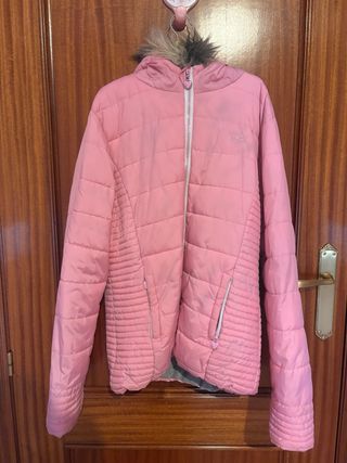 Chaqueta acolchada rosa con diseño de estrellitas, es muy calentita y cómoda. Es una talla M. Está prácticamente nueva. - Capucha con pelo. - Cierre de cremallera. - Bolsillos con cremallera.
