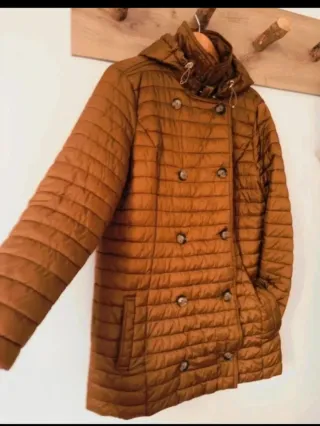 chaqueta acolchada con cierte de botones de click. cuello mao sin extrenar impecable,es talla Ma pero abarca como una L