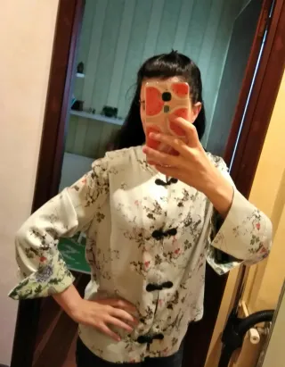 Chaqueta estilo kimono con estampado floral en fondo azul claro, acabado satinado, cuello mao y manga larga. Cierre con botones de nudo. Muy versátil tanto en looks informales como en los más vestidos. Me costó 50€ y lo usé una sola vez, está en perfecto estado. Precio negociable.