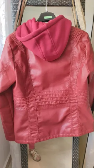 Chaqueta de cuero sintético con capucha de tela. - Cierre de cremallera. - Bolsillos con solapa. - Forro interior acolchado.