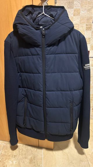 Chaqueta Ecoalf modelo Bale en color azul. Presenta un diseño acolchado en el cuerpo y mangas de punto. - Cierre de cremallera. - Capucha integrada. - Bolsillos laterales con cremallera.