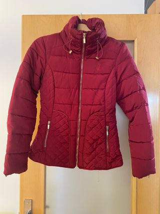 Chaqueta acolchada de invierno en color granate. Presenta un diseño moderno y funcional. - Cuello alto con cordones ajustables. - Cierre de cremallera frontal. - Bolsillos laterales con cremallera. - Detalle de logo bordado en el pecho.