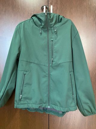 Chaqueta ligera. Tiene capucha. Botones de presión, uno en la manga está roto (foto). Ligeramente perlante