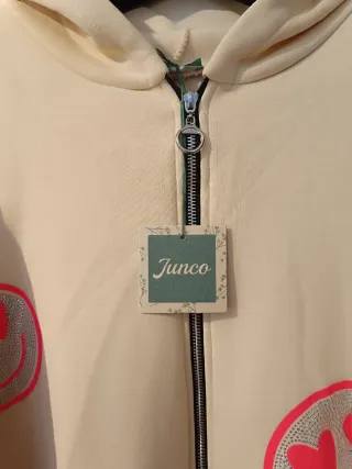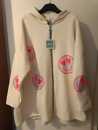 Chaqueta de borreguito con un divertido diseño de smileys. - Estampado de smileys con corazones. - Cierre de cremallera frontal. - Capucha integrada. - Bolsillos a ambos lados. - Contorno pecho cerrada: 140 puede dar bastante talla.