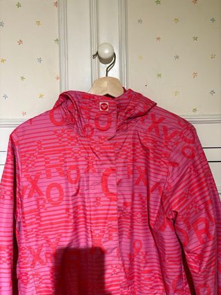 Chaqueta de esquí con un llamativo estampado. Talla S nueva sin estrenar. Precio de compra 120 euros - Diseño con letras y líneas en rosa y rojo. - Capucha integrada. - Cremalleras en los bolsillos.