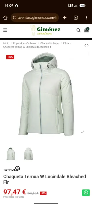 Chaqueta Ternua W Lucindale Bleached Fir. - Diseño moderno y funcional. - Color verde pálido. - Cierre de cremallera frontal. - Capucha integrada.