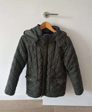 Chaqueta acolchada con diseño de rombos. - Capucha integrada. - Cierre de botones a presión. - Dos bolsillos frontales con solapa y botón. - Talla de niños 15-16 que equivale a la S que uso yo.