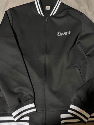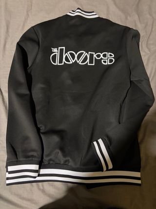 Chaqueta negra con detalles blancos, inspirada en la banda The Doors. Ideal para fans de la música. - Diseño con logo de The Doors en la espalda. - Puños y cuello con bandas blancas.