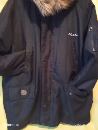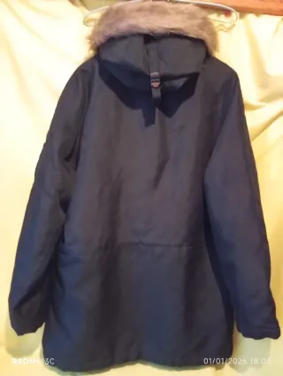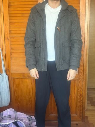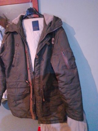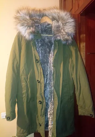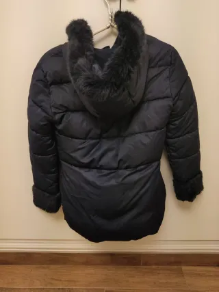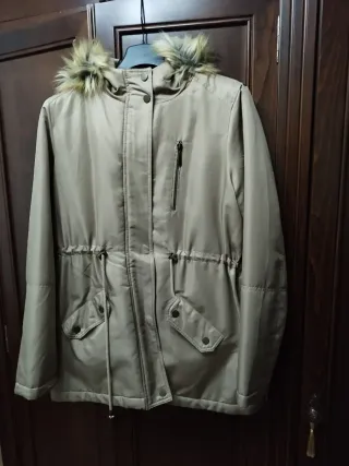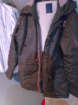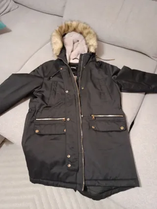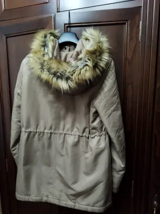 Chaquetón con gorro en buen estado. - Cierre de cremallera. - Cordones ajustables en cintura y bajo. - Bolsillos frontales con solapa. - Capucha con pelo sintético.