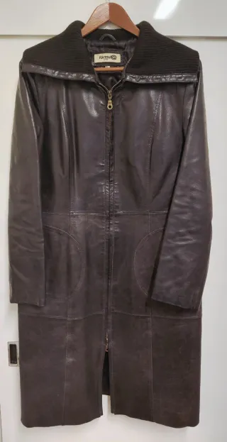 Chaquetón vintage largo de cuero para mujer en color marrón. Presenta un diseño muy original con cierre de cremallera frontal. De la firma Formula Joven. Talla L. En muy buen estado. Años 90. - Cuello de canalé. - Bolsillos delanteros. - Costuras detalladas.