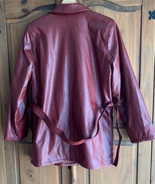 Elegante chaquetón de polipiel para mujer. - Diseño de doble botonadura. - Cinturón a juego para ajustar la cintura. - Cuello solapa clásico. - Bolsillos frontales.