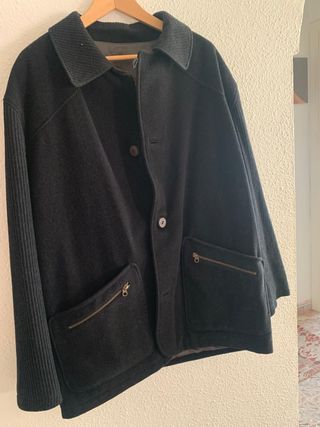 Chaquetón de corte clásico de la firma Caramelo, línea Clásico Sportswear. Confección técnica "Made in Spain" con materiales seleccionados de alta densidad. Presenta un diseño híbrido con mangas de estructura acanalada y cuerpo en paño sólido. Cierre frontal mediante botonadura y dos bolsillos exteriores funcionales con cierre de cremallera metálica de alta resistencia. Incorpora forro interior técnico para optimizar el confort térmico. Medidas técnicas: Axilas: 60 cm Hombros: 57 cm Largo: 81 cm Manga: 63 cm Talla 52 (Equivalencia XL). Excelente estado constructivo.