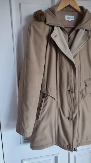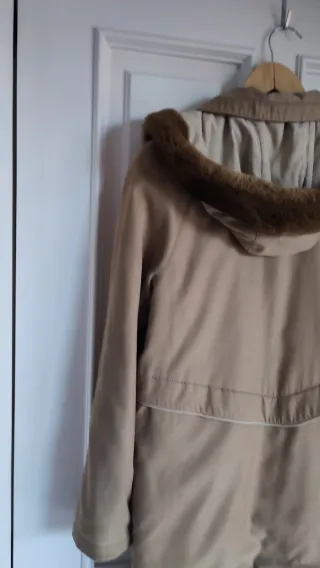 Elegante chaquetón de abrigo en color beige. Talla 40-42 - Diseño clásico. - Cierre de cremallera y botones. - Bolsillos frontales con cremallera. - Detalle de pelo en la capucha. No hago envíos Vendo más cosas