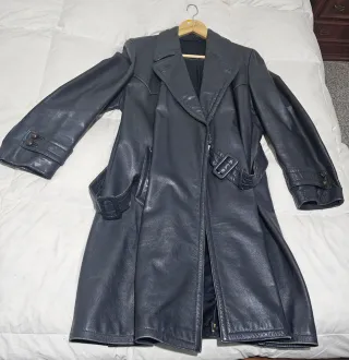 Chaquetón de auténtico cuero alemán en color negro. Un clásico atemporal. - Diseño tipo gabardina. - Cinturón ajustable con hebilla. - Puños con detalle de botones. Talla entre 54 y 56
