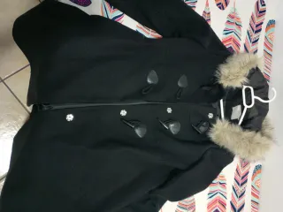 Chaquetón negro con capucha y detalles de moda. Medido con cinta métrica hombros 60, pecho de un lado al otro 68, largo 84 centímetros forro con cordón en la cintura. - Cierre de botones. - Bolsillos frontales. - Capucha con pelo sintético. - Detalle de cremallera en manga. Rebajado en 12 euros.