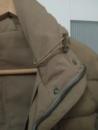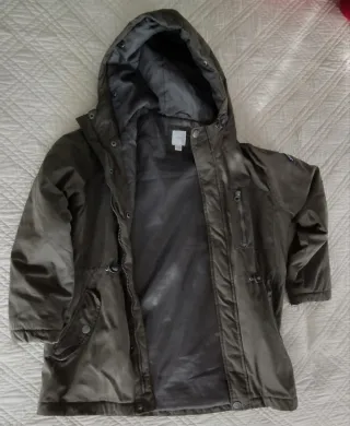 Chaquetón para chico de la marca Sfera en color verde oliva. Es una prenda de abrigo con capucha forrada de pelo sintético. Talla 11-12 años. Tiene una costura al lado del bolsillo izquierdo, pero no se nota mucho - Cierre de cremallera y botones. - Bolsillos con cremallera en el pecho. - Cintura ajustable con cordón. - Puños elásticos.