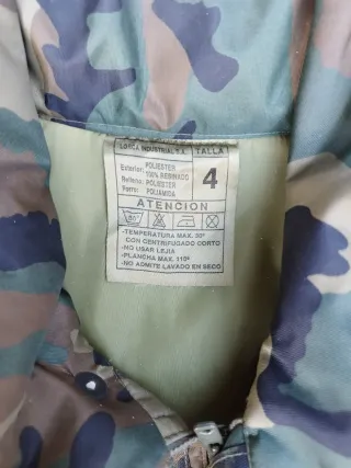 1 Chaquetón de camuflaje para la intemperie talla 1 15€ 1 Chaquetón y pantalón intemperie talla 1 25€ 1 Chaquetón intemperie con forro polar y pantalón intemperie talla 2. 35€ SE PUEDEN VENDER POR SEPARADO - Diseño con múltiples bolsillos frontales. - Cierre de cremallera y solapa. - Puños ajustables con velcro. - Insignia de la bandera española en la manga.