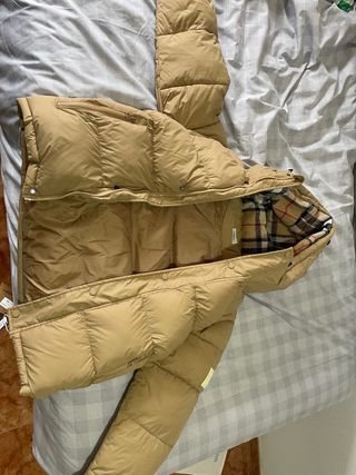Chaqueta acolchada de la marca Burberry en color beige. Presenta un forro interior con el clásico estampado de cuadros en el gorro. - Cierre de cremallera y botones a presión. - Bolsillos frontales con cremallera. - También se pueden quitar las mangas para hacerlo chaleco