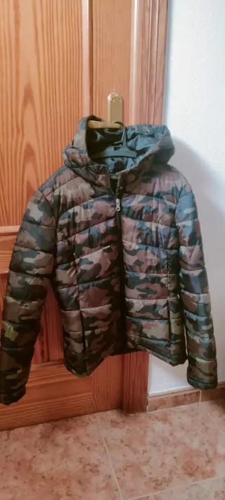 Chaquetón plumífero con estampado de camuflaje. - Diseño unisex. - Capucha integrada. - Acolchado para mayor calidez. -talla L equivalente a una M.