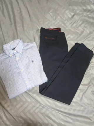 5 camisas talla M de Zara Man y Álvaro Moreno. 3 pantalones 1 zara man otro Álvaro moreno vaquero tienda local 1 chaquetón Le falta el carrete de la cremallera. 1 jersey NO ES VERDADERO