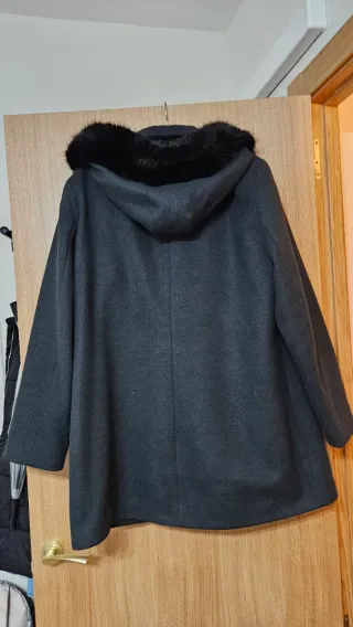 Elegante Chaquetón o trenca, con capucha con pelo extraíble, de marca Opción Concept, cierre cremallera y corchetes. Talla 44, es un tres cuartos de largo. Paño suave, e interior forrado, y tiene cuello. Usado una sola vez para un evento, estado nuevísimo. Calentito y confortable. Medidas, largo 83 centímetros, y de sisa a sisa (axila a axila) 60 centímetros.