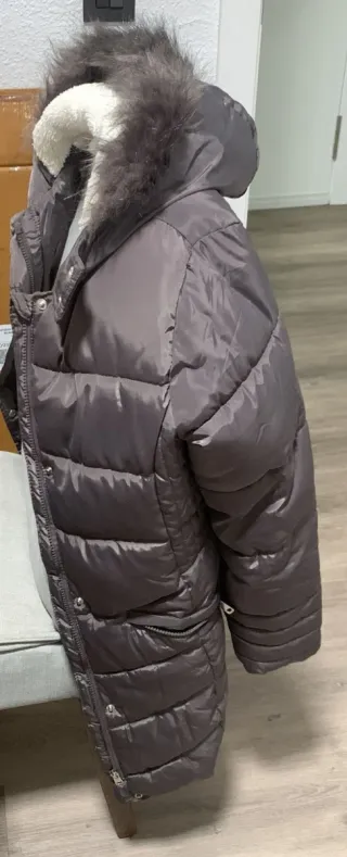 ¡Prepárate para el frío con estilo! Abrigo/chaquetón largo en color gris topo, ideal para mantenerte abrigada sin perder la elegancia. Características principales: Diseño: Acolchado con costuras decorativas onduladas. Detalles: Capucha con ribete de pelo sintético suave y extraíble con cremallera Cierre:Corchetes frontales completa para mayor comodidad y cremallera con doble tiro. Estado: En excelentes condiciones, muy poco uso.