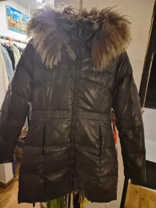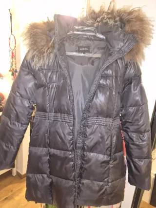 Super abrigadito ,ligero y Elegante chaquetón plumífero de color gris antracita, usado en 2 ocasiones, perfecto para el frío de la gran marca italiana kocca. - Diseño acolchado. - Capucha con pelo de cabra - Cintura marcada para un ajuste favorecedor. - Bolsillos laterales.
