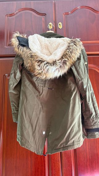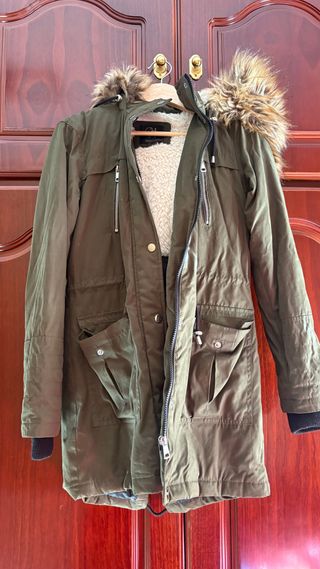 Elegante chaquetón de Zara en color verde militar, perfecto para el frío. - Capucha con pelo sintético. - Cierre de cremallera. - Bolsillos laterales.