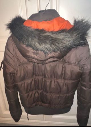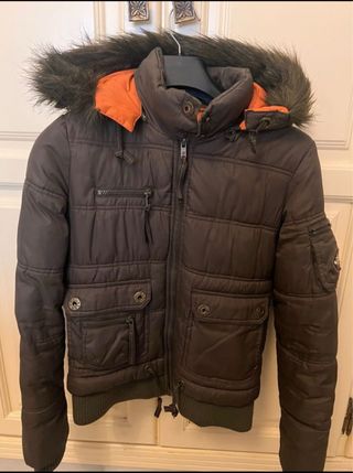 Chaquetón de invierno con capucha desmontable y forro interior naranja. - Cierre de cremallera. - Bolsillos frontales con solapa y cremallera. - Puños elásticos. - Detalle de pelo sintético en la capucha. -pequeño defecto última foto