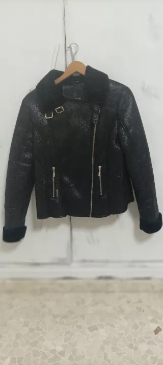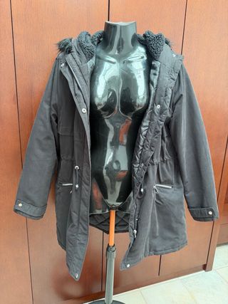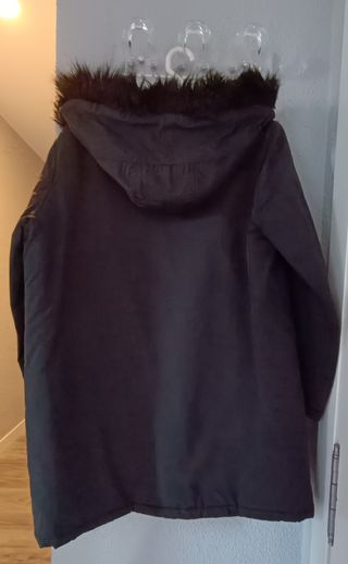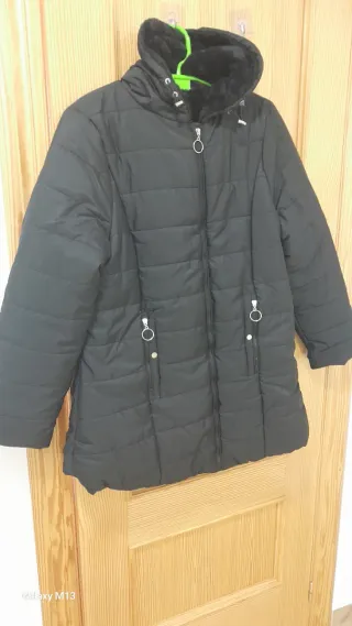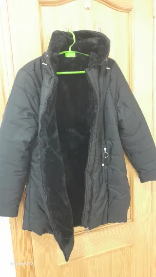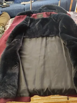 Chaquetón negro con cierre de cremallera, capucha con pelo en el borde, 2 bolsillos con cremallera y forro acolchado y de pelo en la parte superior. Talla L. Abriga mucho y se lava y plancha fácilmente. Muy poco uso.