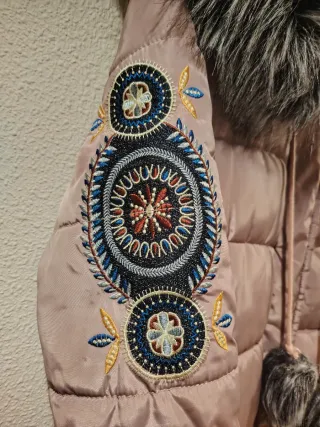 Chaquetón de corte 3/4 con un bonito diseño. Todo forrado de pelo por dentro. Súper calentito. - Detalle de bordados en las mangas. - Capucha con pelo sintético. - Dos pompones decorativos.