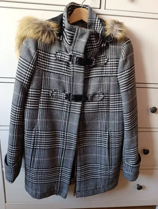 Chaquetón de cuadros con detalles de pelo en la capucha. - Diseño a cuadros en tonos grises y negros. - Cierre con hebillas y cremallera. - Capucha con pelo sintético.