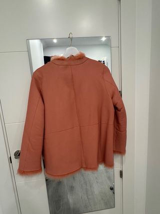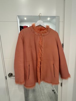 Abrigo reversible de Uterque en color coral muy favorecedor. Un diseño elegante y original que permite llevarlo de dos formas: por el lado de piel lisa o por el lado de pelo, perfecto para cambiar el look. Talla S. El abrigo está en buen estado general, aunque presenta algunos pequeños roces en la piel por el uso, visibles en las fotos adjuntos.