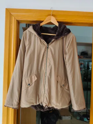 Chaquetón reversible con capucha. En perfecto estado. Muy ligero, no pesa. - Acabado exterior en color beige, impermeable. - Interior de pelo marrón.