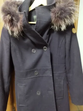 Chaquetón de mujer con capucha y detalle de pelo. - Cierre con cremallera y botones. - Cintura ajustable con cordón. - Bolsillos laterales. -Muy buen estado, apenas usado.